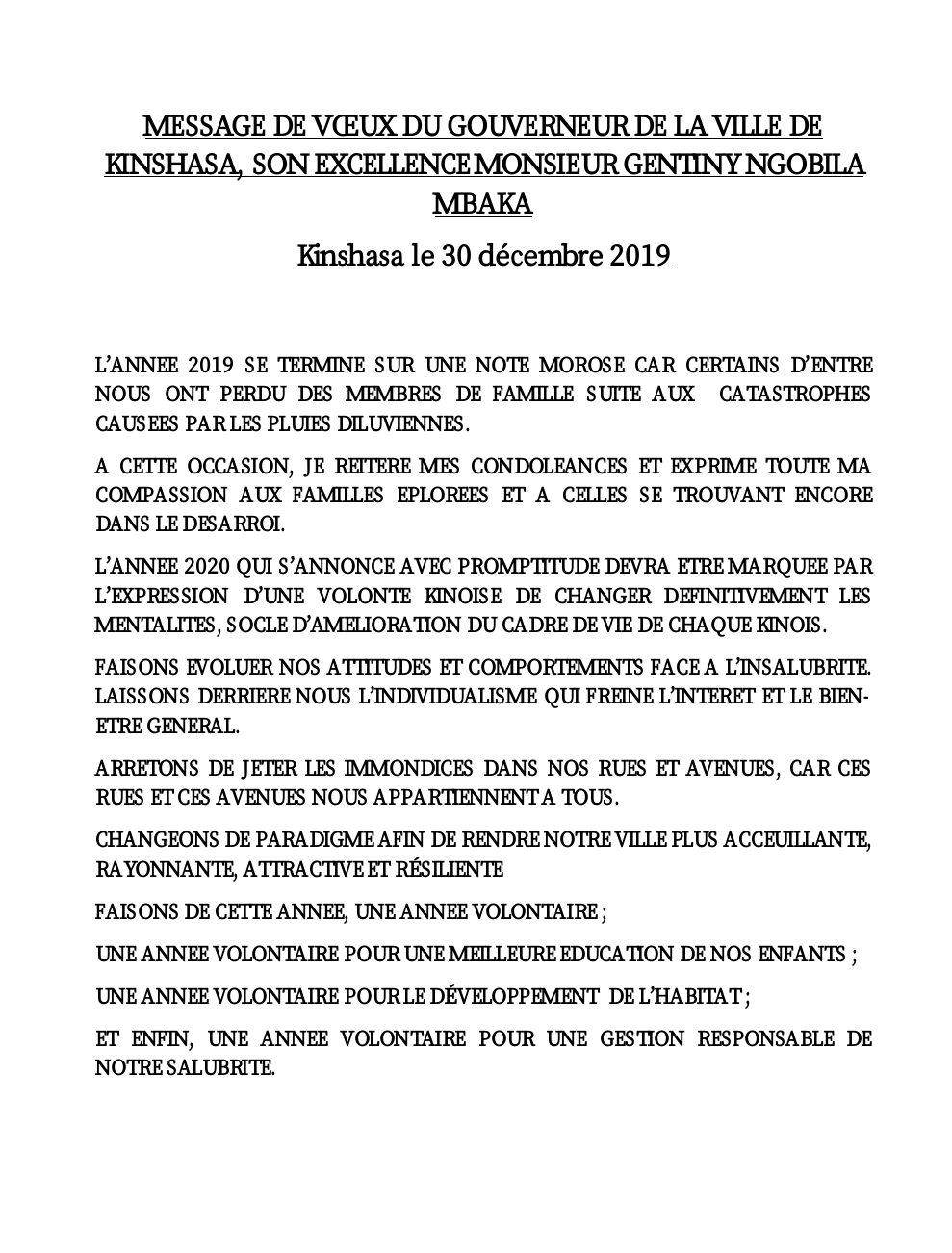 Dans son message de vœux ce lundi 30 décembre 2019, le gouverneur de la ville de Kinshasa, Gentiny Ngobila Mbaka a réitéré ses condoléances et exprimé sa compassion aux familles éplorées et à celles se trouvant encore dans le désarroi.
