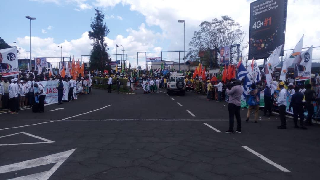 C'est en grande nombre que des militants de la coalition politique et électorale Front Commun pour le Congo (FCC) s'amassent à l'aéroport international de Goma pour accueillir Emmanuel Ramazani Shadary, candidat président de la République numéro 13 et Marie-Olive Lembe l'épouse du chef de l'État pour communier avec sa base ce dimanche 16 décembre au stade Les volcans de Birere.