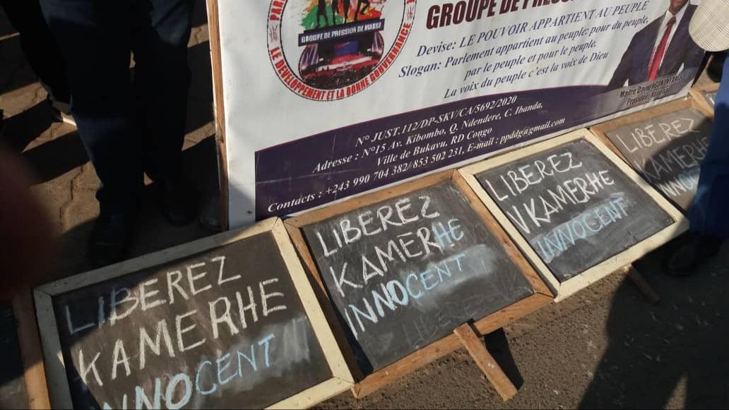 Ces jeunes entonnant des chansons, avaient des calicots et pancartes sur lesquels on pouvait lire : « Libérez Kamerhe, innoncent ».